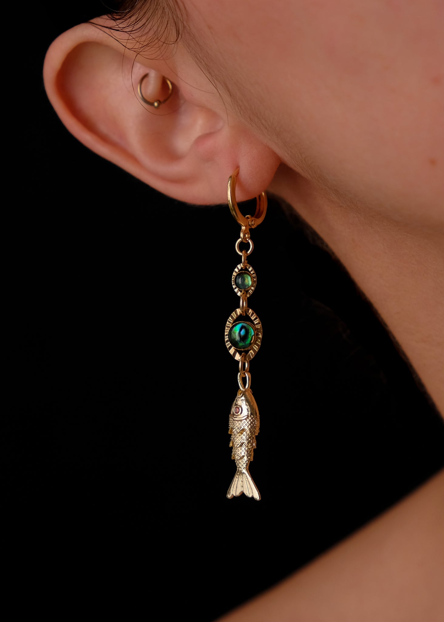 Par dispar de aretes con dijes de concha de abulón y pez.